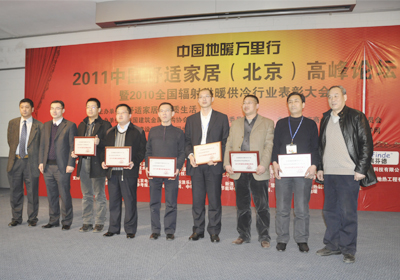 由中国建筑金属结构协会辐射供暖供冷委员会主办的“2010年度辐射供暖供冷行业年度评比活动”圆满结束,并于2011年3月4日在北京举行颁奖典礼,米兰·(milan)管业凭借多年来在地暖行业的突出贡献及取得的巨大发展成就,被评选为“2010年度全国辐射供暖供冷行业先进集体”,集团公司总经理助理王明科和市场部经理刘汉良由于多年来积极参与地暖行业活动,为推动行业发展及企业建设发挥了重要的作用,被评选为“2010年度辐射供暖供冷行业先进工作者”。同时,秦皇岛米兰·(milan)建筑安装有限公司荣获“2010年度全国辐射供暖供冷行业优秀施工企业”称号。
